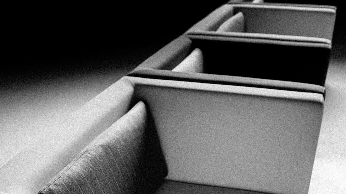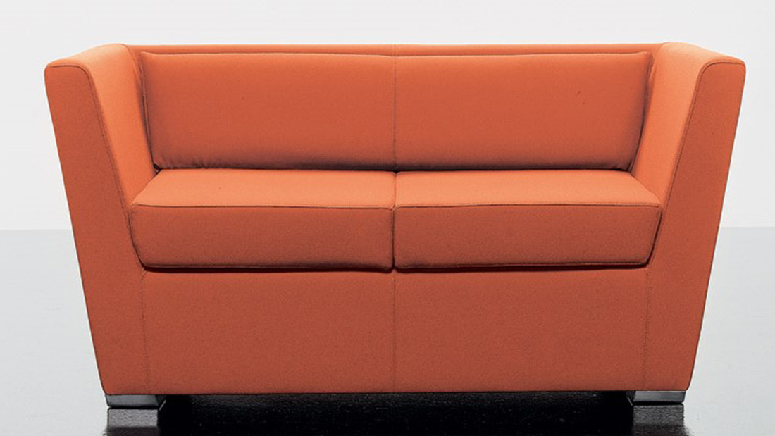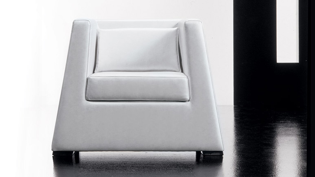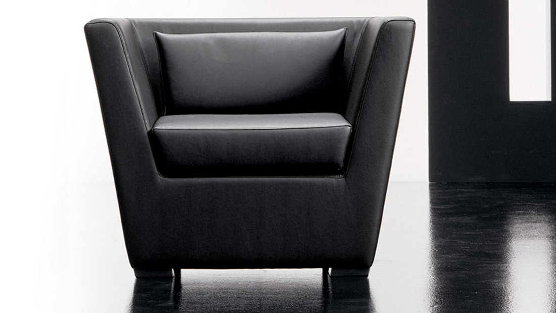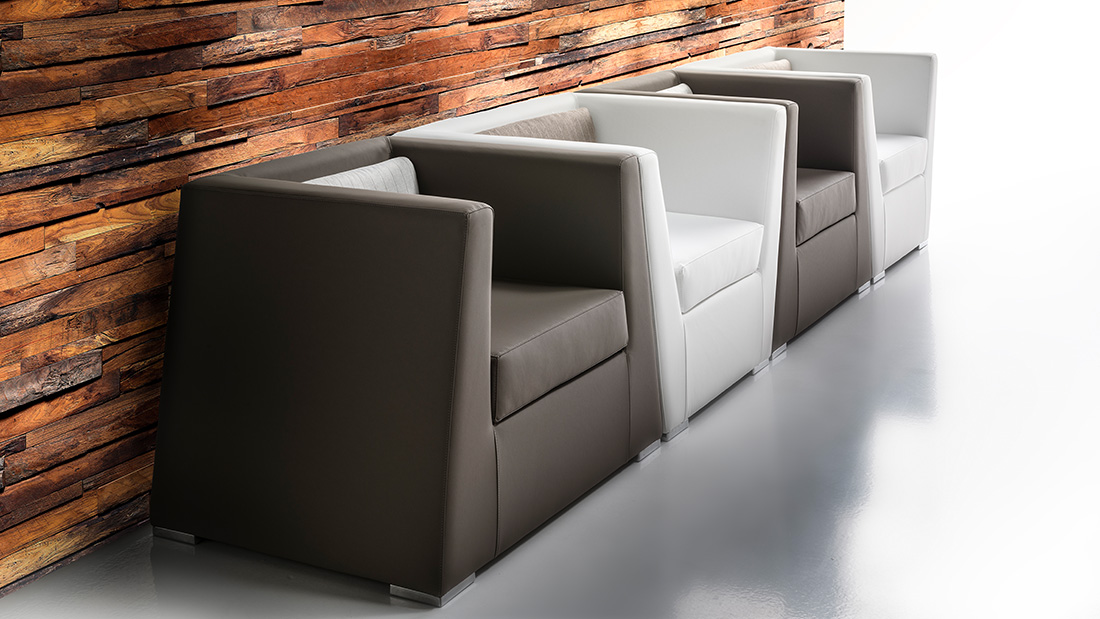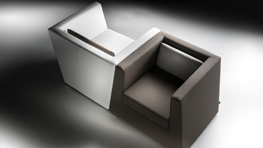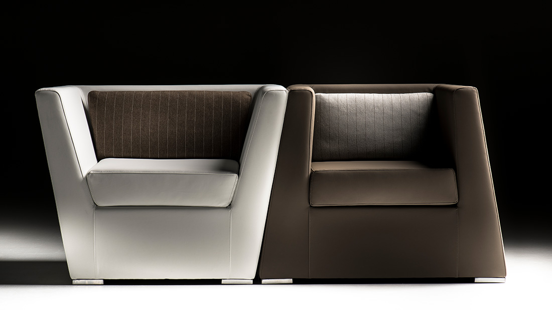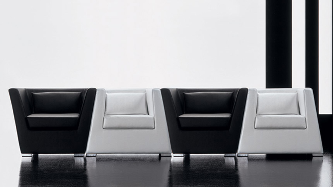Snugly interlocking elegant armchairs with structure in multi layered beech and covered in foamed polyurethane.Chromed steel feet.Available also as two-seater sofas.